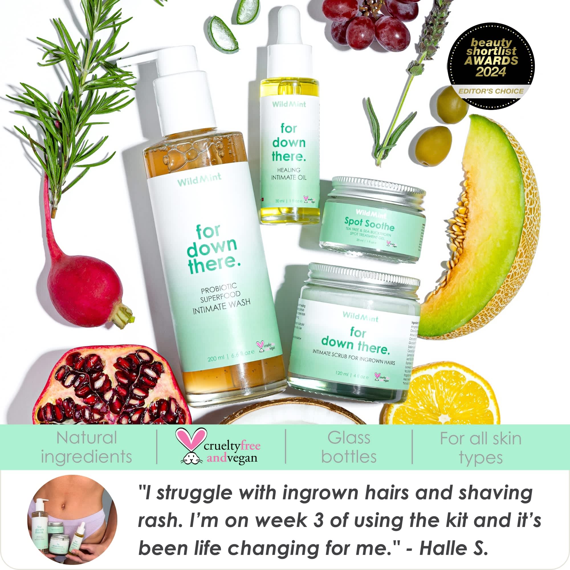 A healing intimate oil to soothe itchiness, treat ingrown hairs & razor bumps. While nourish and soften dry skin.